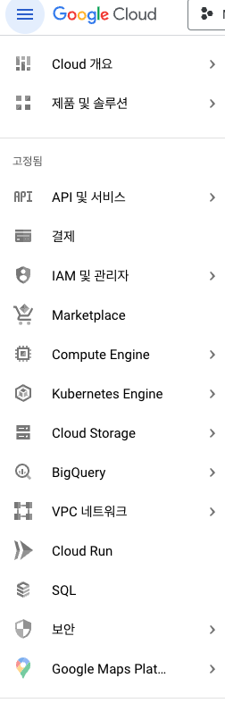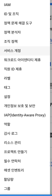 옆에 메뉴탭을 누르고 IAM 및 관리자를 누르고 서비스 계정을 누른다.