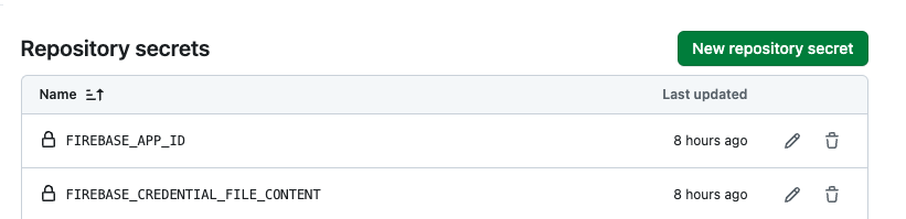 아마 처음 들어가면 비어있을텐데 New repository secret을 누르고 추가를 하면 된다.