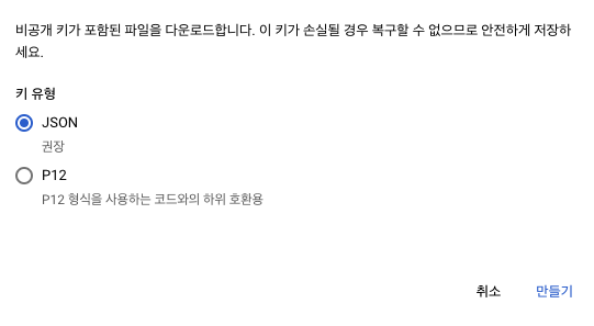 키 추가를 누르면 오른쪽과 같이 키를 만들수 있고, Json 형태로 만들어지고 다운이 된다.