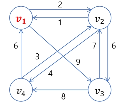 만약 v1을 출발점으로 잡는다면 가능한 경로와 그에 비용은 아래와 같다.