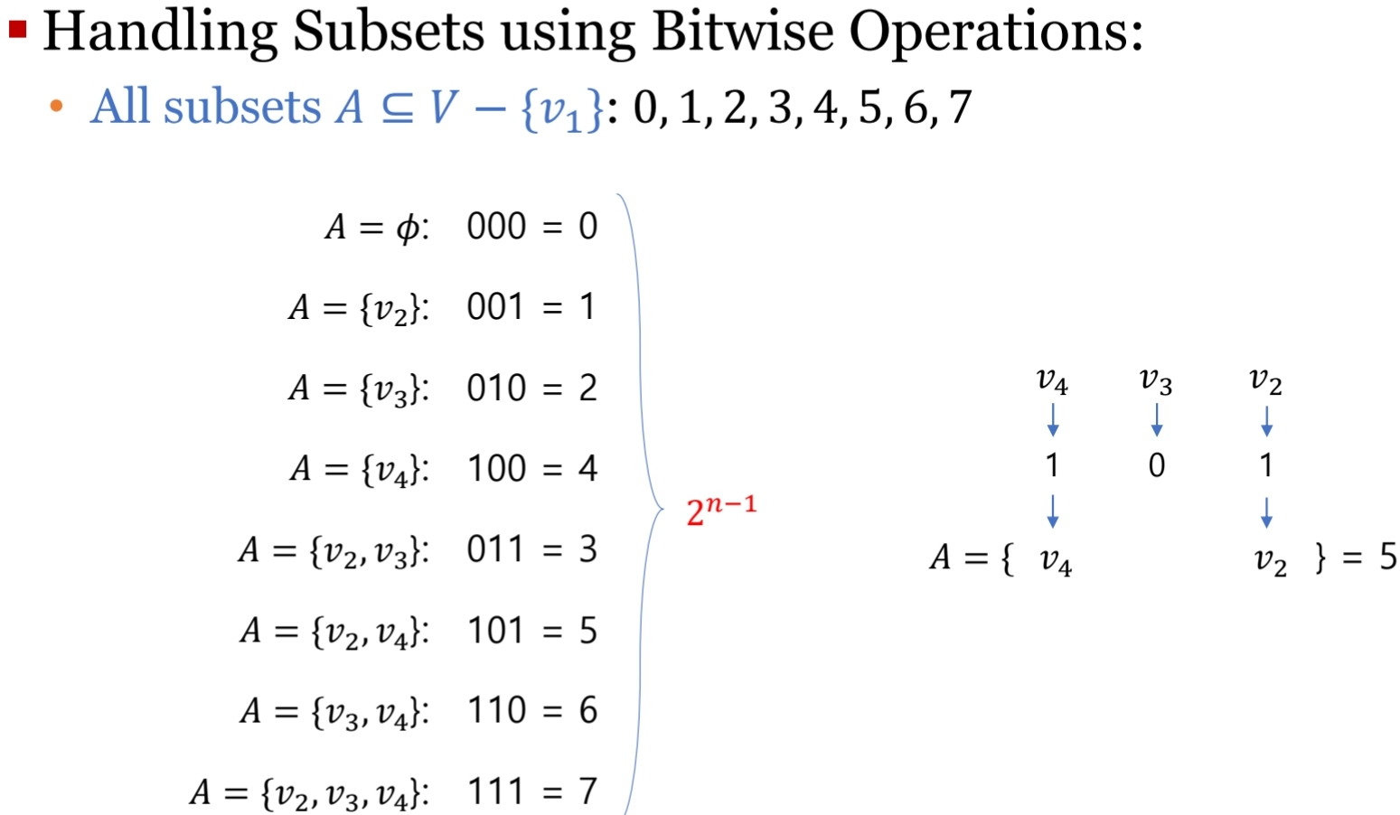 - 만약 A가 111이라면 {v2,v3,v4}를 포함한다는 뜻이다. 그리고 j가 v3을 뜻하는 010이라면 어떻게 A에서 v3을 빼줘야할까?