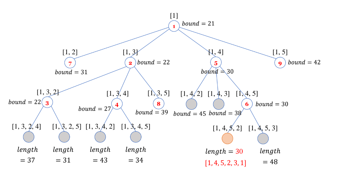 - 결과는 [1,4,5,2,3,1]이 최적 경로가 되고 그 길이의 합은 30이 된다.