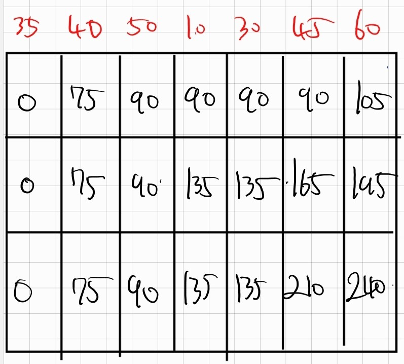 다음으로 10까지 접근했을때의 최댓값은 40과 50을 태운 90 vs (35+40), (50+10)중 후자의 값이었다.