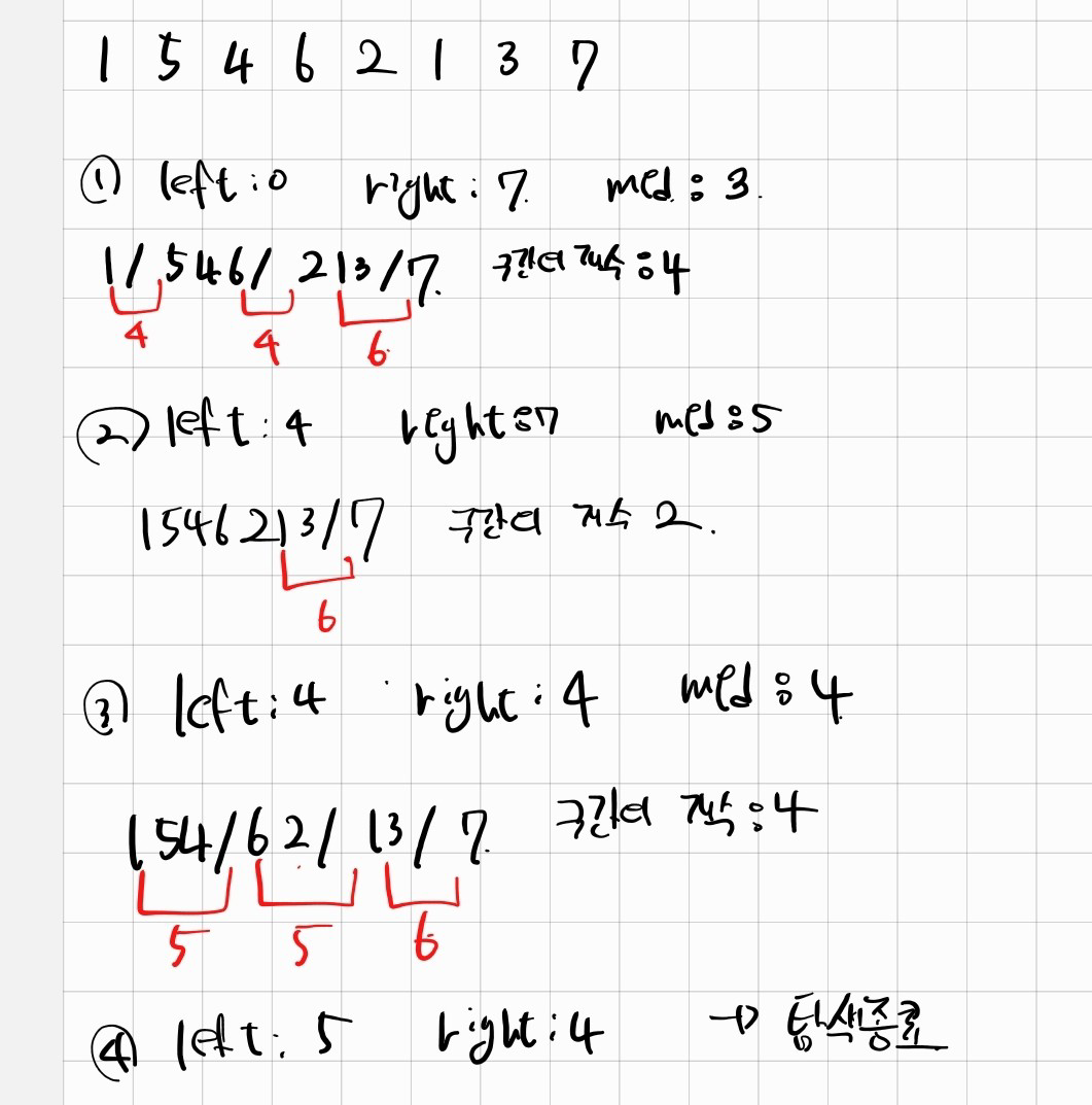- left와 right 합의 절반인 mid를 구하고 mid에 대해서 mid를 최대로 구간을 나눌 수 있는지를 검사한다.