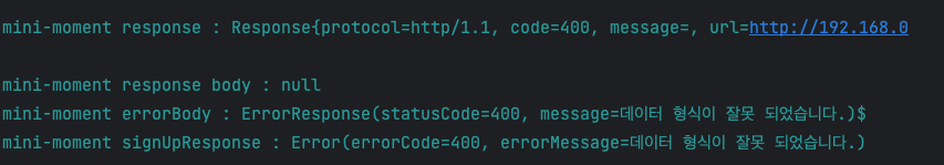OkHttpClientLog에는 제가 의도란 대로 실패 처리와 body가 정확하게 들어온 것을 확인할 수 있었습니다.