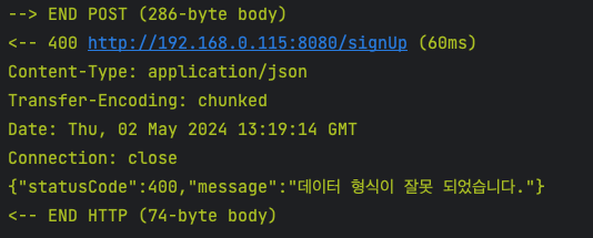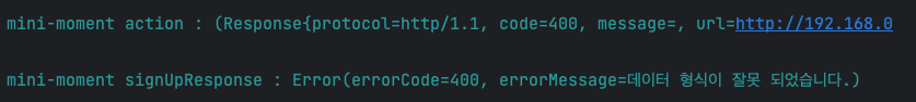 OkHttpClientLog에는 제가 의도란 대로 실패 처리와 body가 정확하게 들어온 것을 확인할 수 있었습니다.