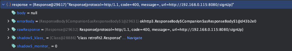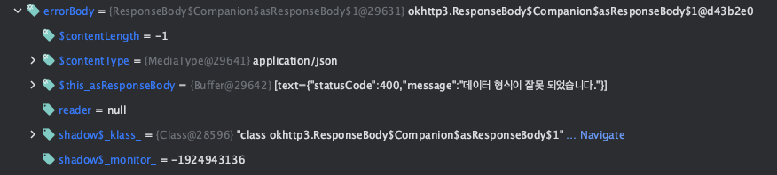 response의 속성 중 body는 null로 찍혀있고, errorBody를 찾을 수 있었습니다.