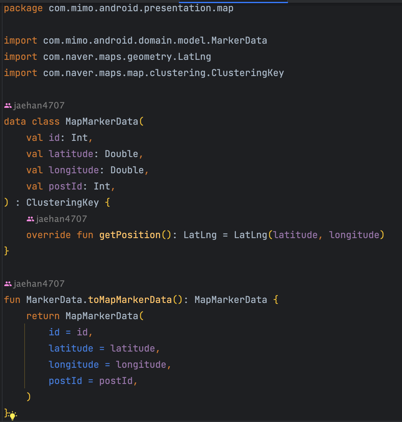domain에서는 순수한 정보인 MarkerData를 사용하고, UI에서 domain의 MarkerData를 기반으로 ClusteringKey를 상속받는 MapMarkerData로 변환하는 함수를 통해 UI에서 사용하도록 했습니다.