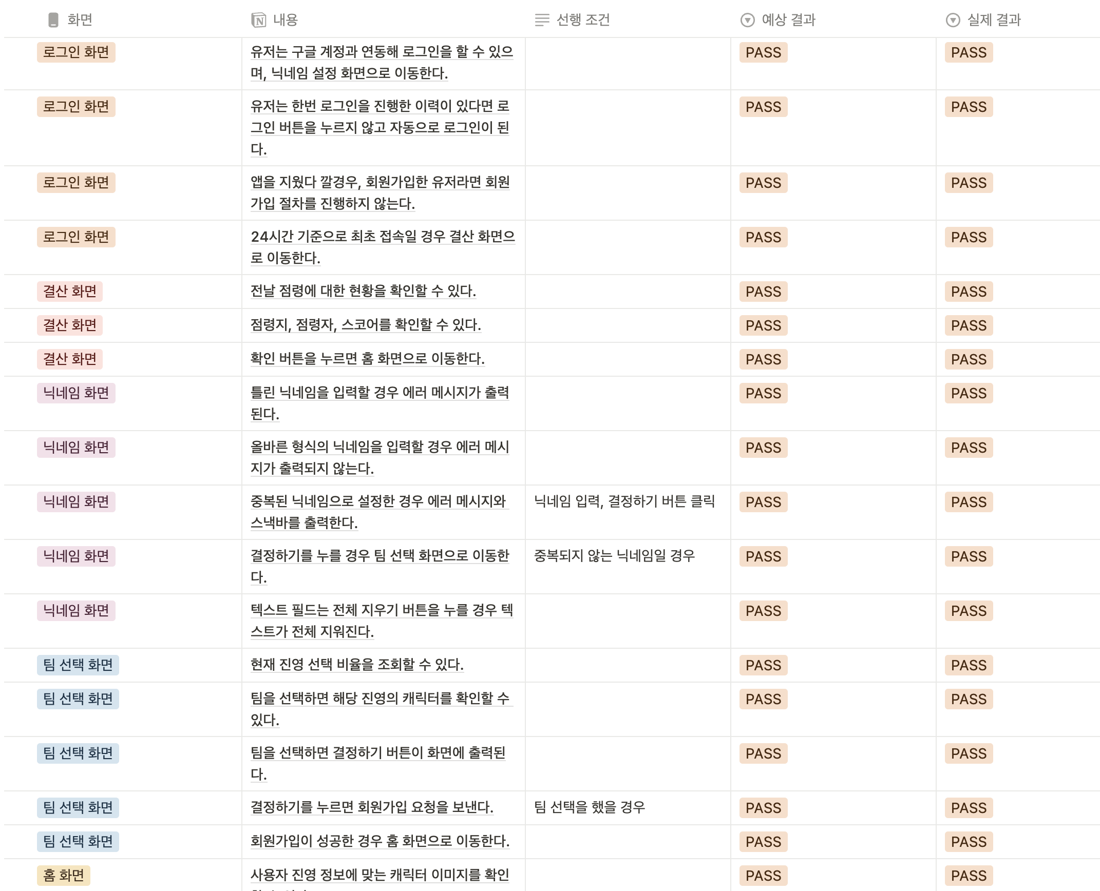 크게 화면으로 나누고, 검증할 내용과 선행조건을 입력했습니다.