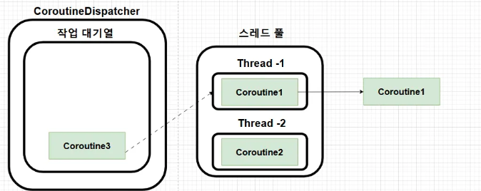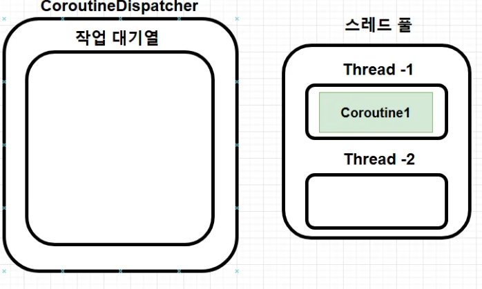 CoroutineDispatcher 객체는 실행돼야 하는 작업을 저장하는 작업 대기열을 가지며, CoroutineDispatcher 객체가 사용할 수 있는 스레드풀에는 thread-1, Thread-2라는 2개의 스레드가 포함된다.