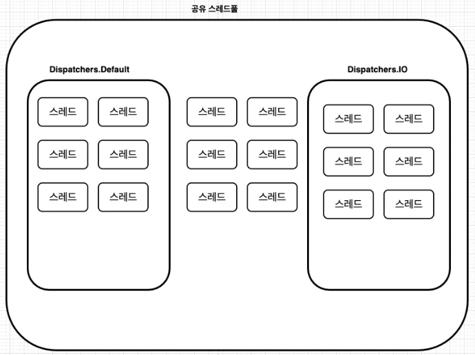 - Dispatchers.IO와 Dispatchers.Default는 코루틴 라이브러리에서 제공하는 공유 스레드풀을 사용한다.