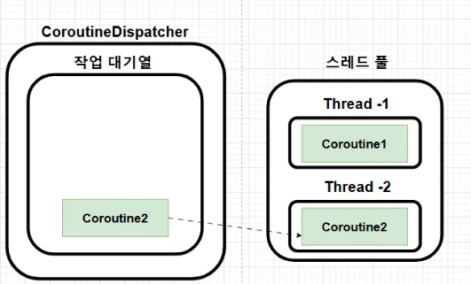 - CoroutineDispatcher 객체는 코루틴을 스레드로 보내 실행하는 객체이다. 코루틴을 작업 대기열에 적재한 후 사용이 가능한 스레드로 보내 실행한다.