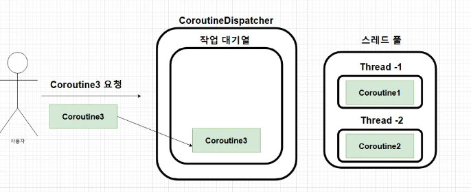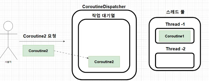 이런 CoroutineDispatcher 객체에 Coroutine2 코루틴의 실행이 요청되면 CoroutineDispatcher 객체는 실행 요청받은 코루틴을 작업 대기열에 적재한다.