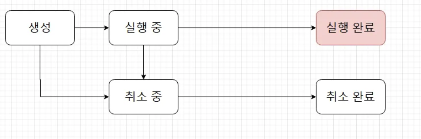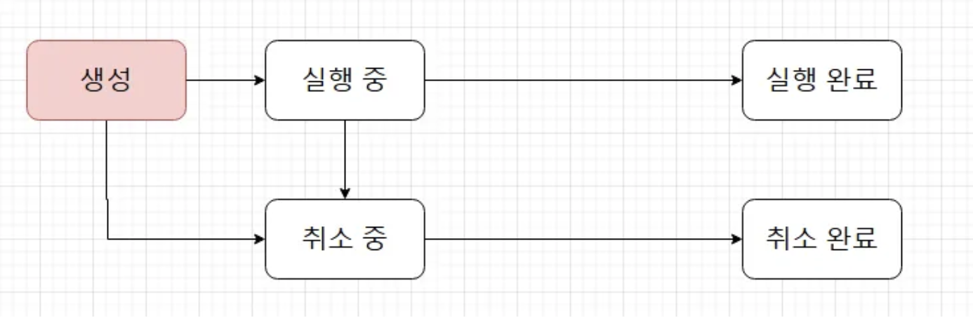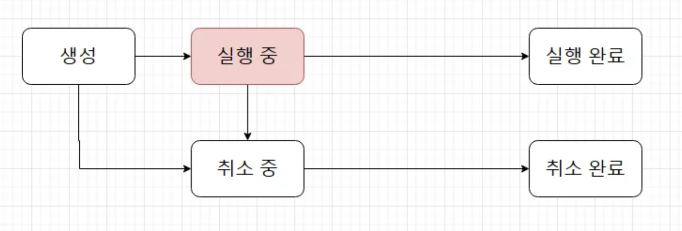 코드의 실행 결과를 보면 생성된 후 실행 X, 취소 요청 X, 실행 완료 X → 모두 false가 반환된다.