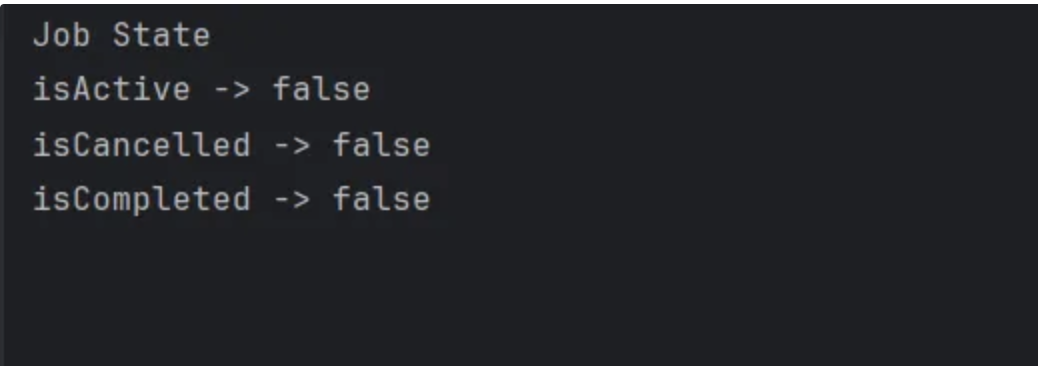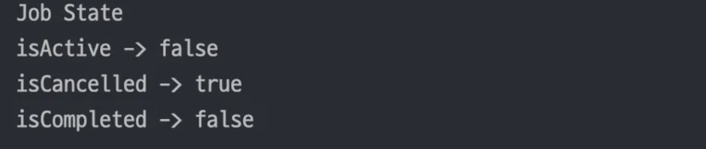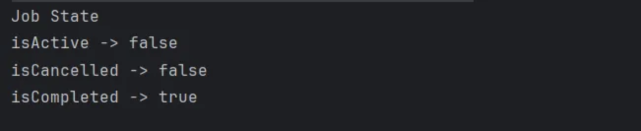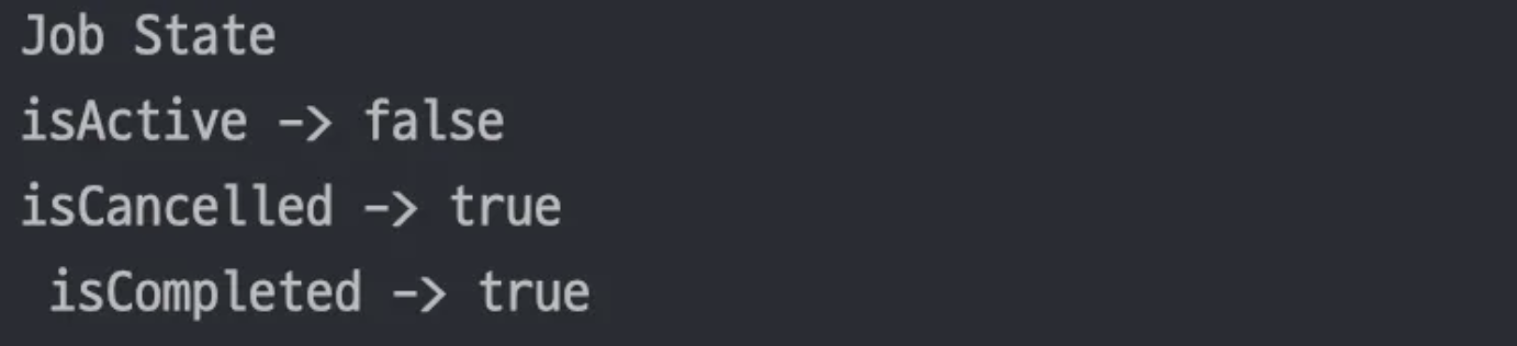 - isCompleted : 코루틴 실행이 완료됐는지의 여부, 실행 중일 경우 false를 반환하고, 실행 완료, 취소 완료일 경우 true를 반환한다.