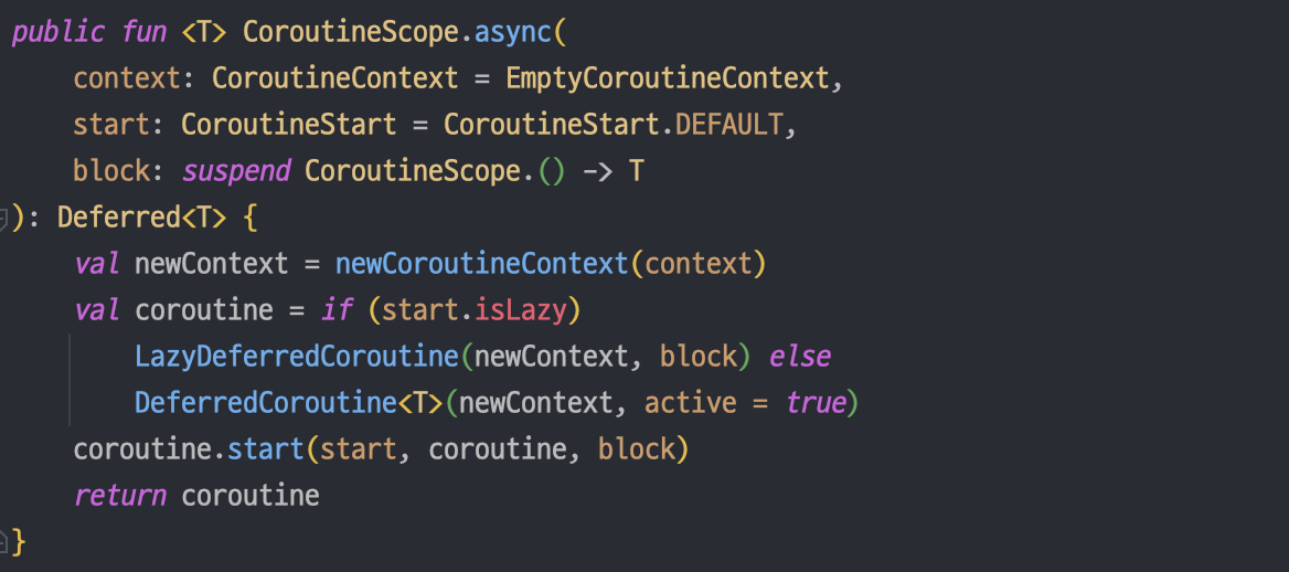 - async 함수를 사용해 코루틴을 실행하면 코루틴의 결과를 감싸는 Deferred 객체를 반환받는다.