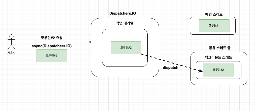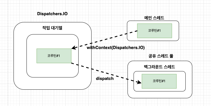 - 따라서 위 코드에서 withContext(Dispatcher.sIO)가 호출되면 해당 코루틴은 다시 Dispatchers.IO의 작업 대기열로 이도한 후, Dispatchers.IO가 사용할 수 있는 스레드 중 하나로 보내져 실행된다.