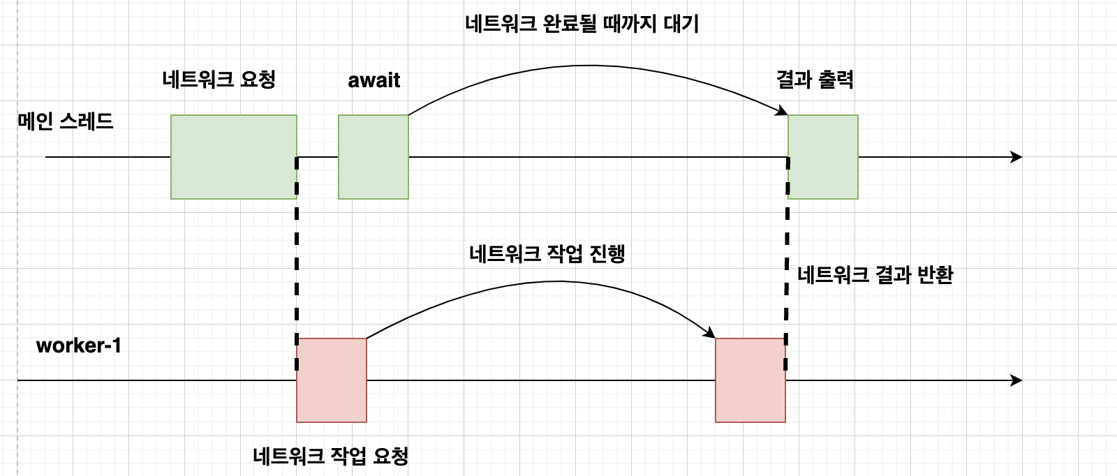 즉 async-await를 사용하면 새로운 코루틴을 만들지만 await 함수가 호출돼 순차 처리가 돼 동기적으로 실행되는 것이다.