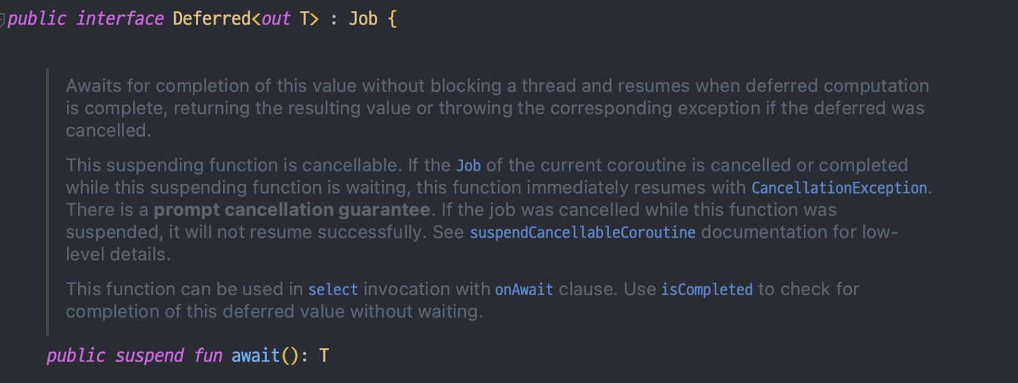 - Deferred는 await 함수를 통해 결과값을 반환할 때까지 코루틴을 일시 중단시킬 수 있다.