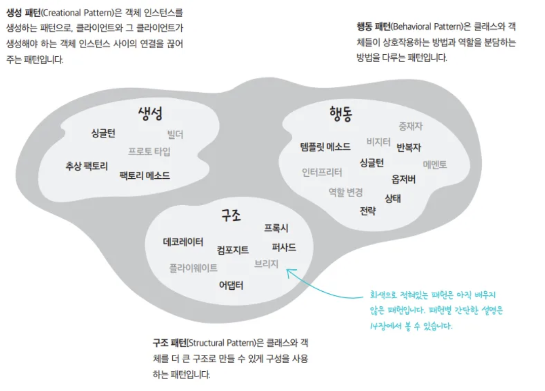디자인 패턴은 크게 생성(Creational), 구조(Structural), 그리고 행위(Behavioral) 패턴으로 분류된다.