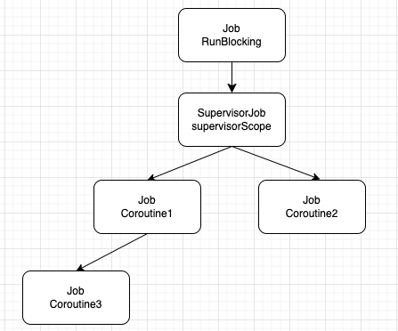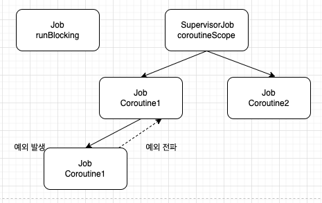 위 코드는 runBlocking 함수에 의해 루트 Job 객체가 생성되고, 자식 코루틴으로 SupervisorJob 객체를 가집니다.