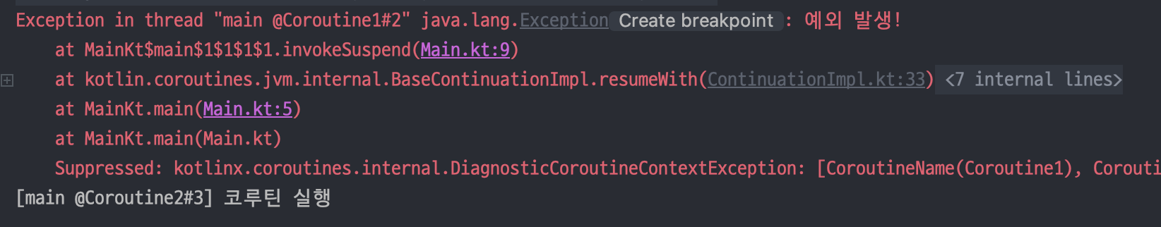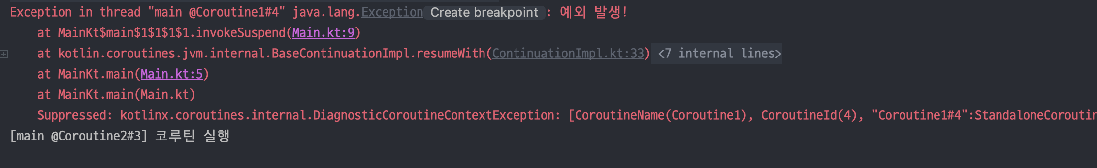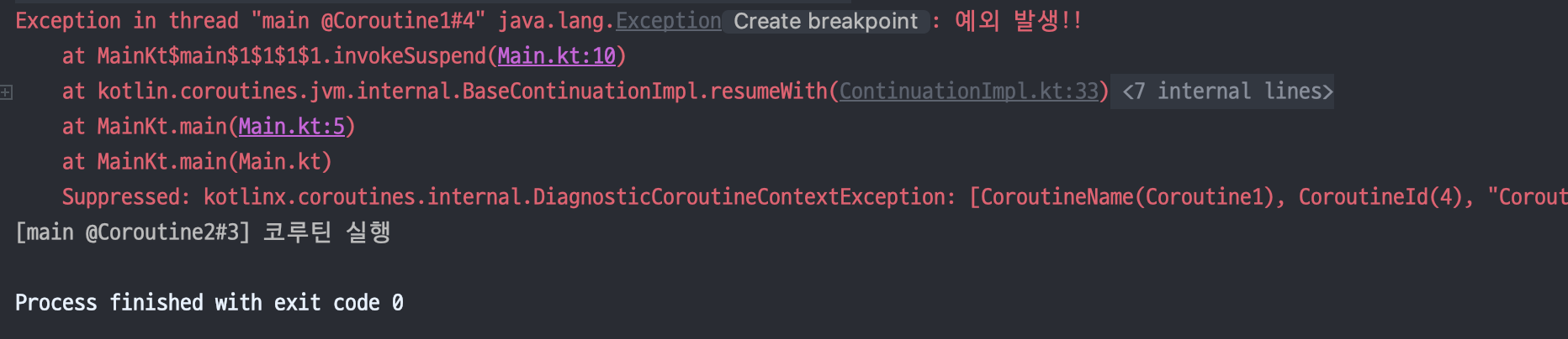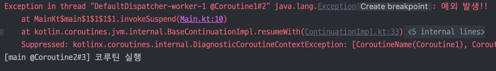 코드를 실행해 보면 예외가 발생했음에도 코루틴 2가 정상 실행되는 것을 확인할 수 있습니다.