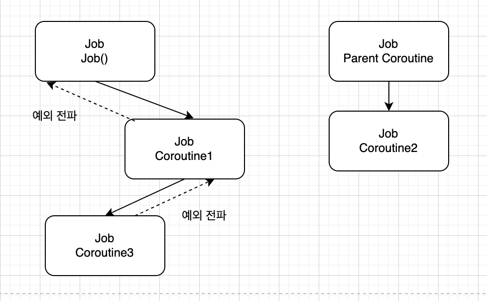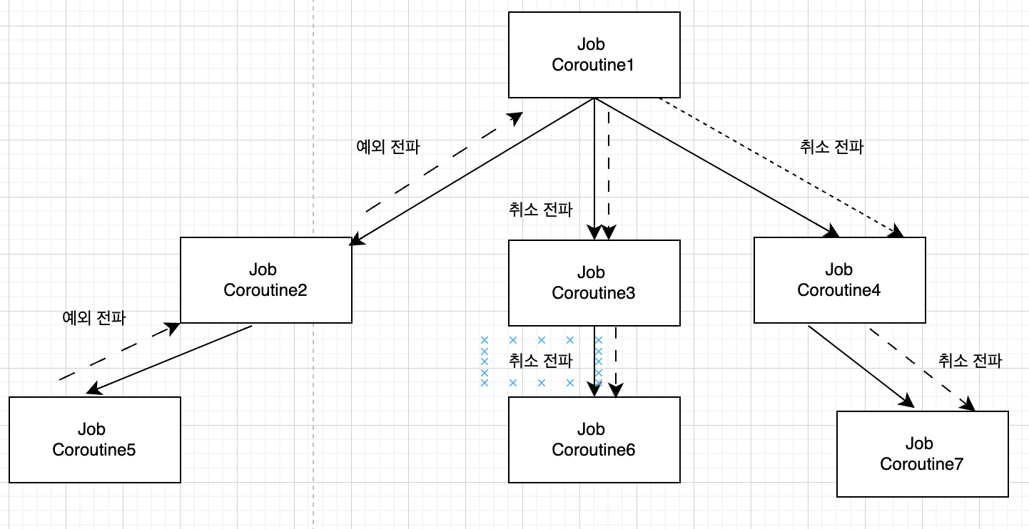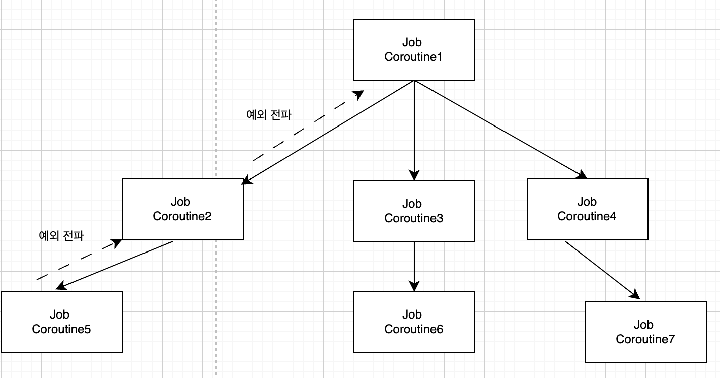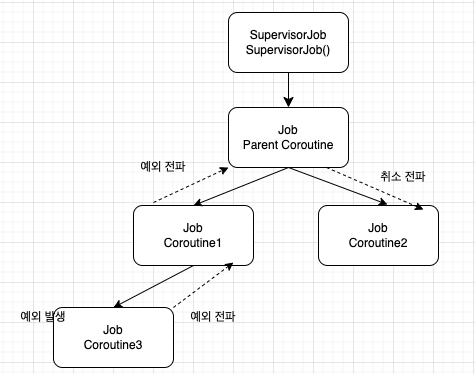 코루틴 3에서 발생한 예외가 코루틴 1을 통해 부모 코루틴까지 전파돼 취소되며, 자식 코루틴인 코루틴 2도 취소됩니다.