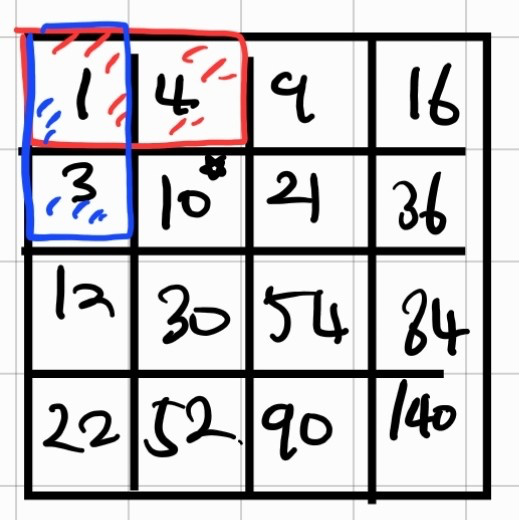 위 그림은 1x1부터 4x4까지의 이차원 누적합을 저장한 배열입니다.