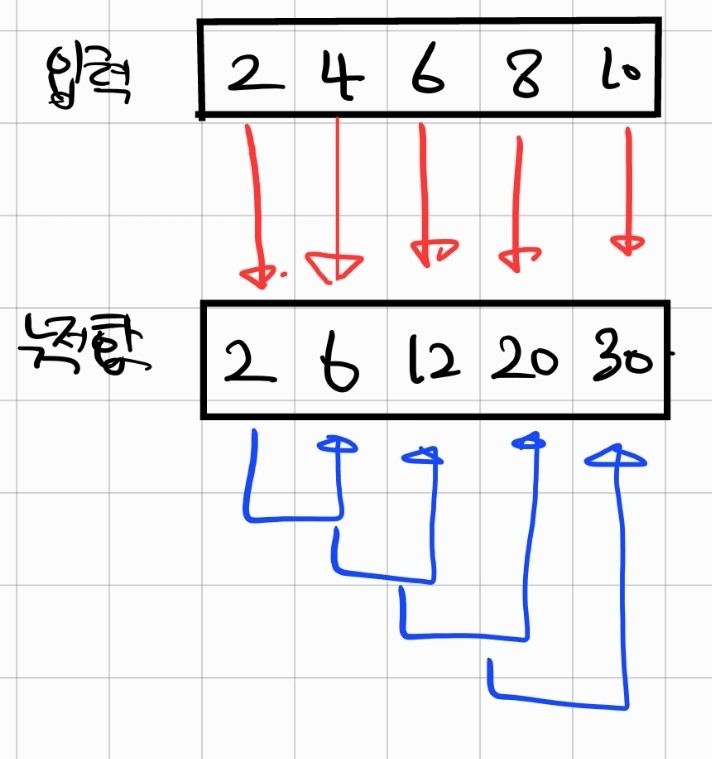 입력으로 [2,4,6,8,10] 이라는 배열이 주어진다면, 누적합은 위와 같이 구할 수 있습니다.