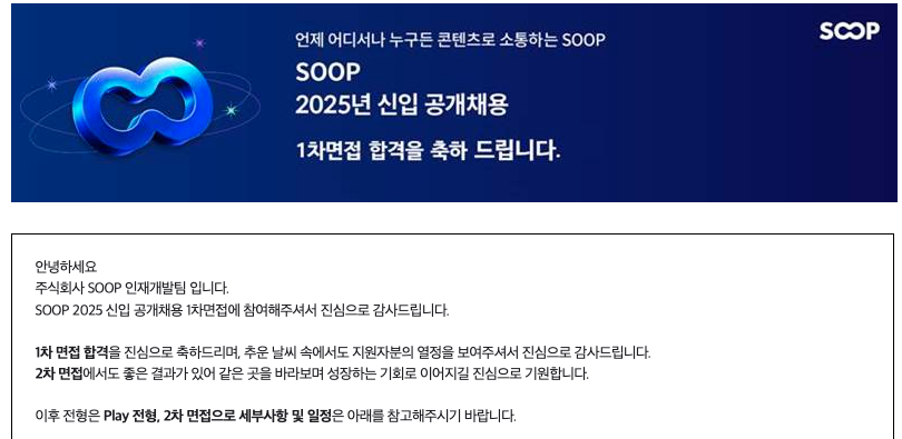 사실 SOOP 서비스를 많이 이용해 왔다고 자부할 수 있고, 지원 목표가 1차 면접 합격하고, Play 전형 경험만 해보자라고 할 정도로 기대를 많이 했었습니다.