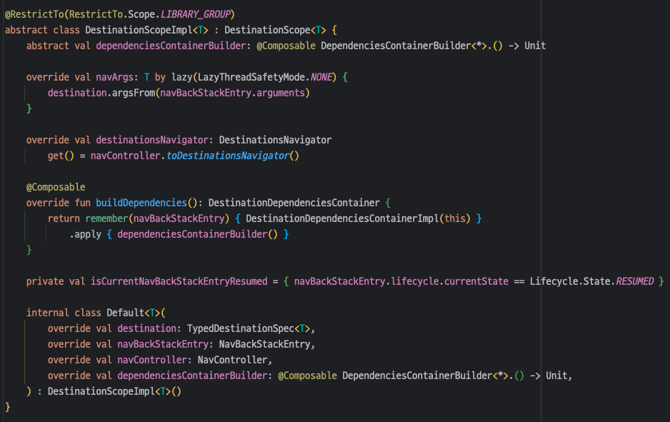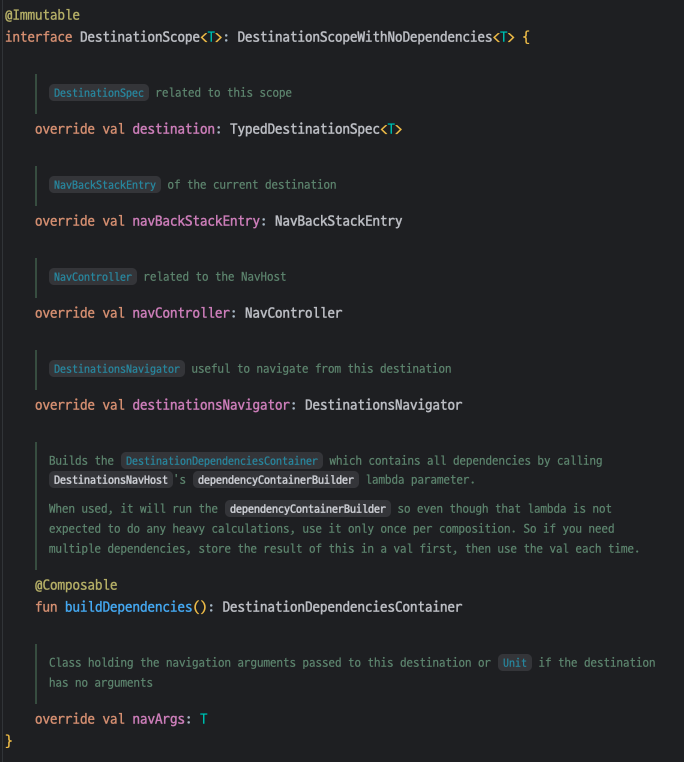 - @Destination 어노테이션의 navArgs에 대응되는 클래스를 선언하면 Type Safe한 네비게이션 인자를 지원한다.
