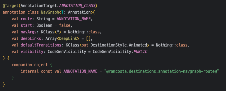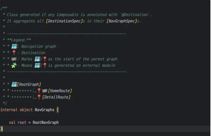 처음에 kdoc를 활용해서 제가 어노테이션을 생성할 수 있을 줄 알았는데 빌드 후 생성된 NavGraphs 코드를 타고 들어가면 생성되네요!