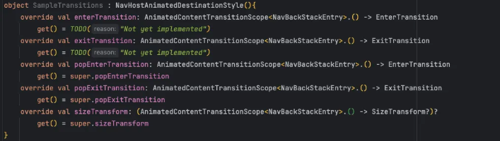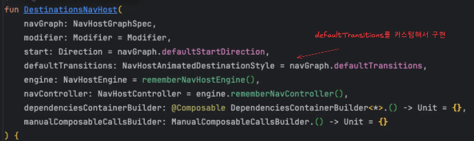DestinationNavHost의 파라미터인 defaultTransitions를 커스텀해서 구현해 줍니다.