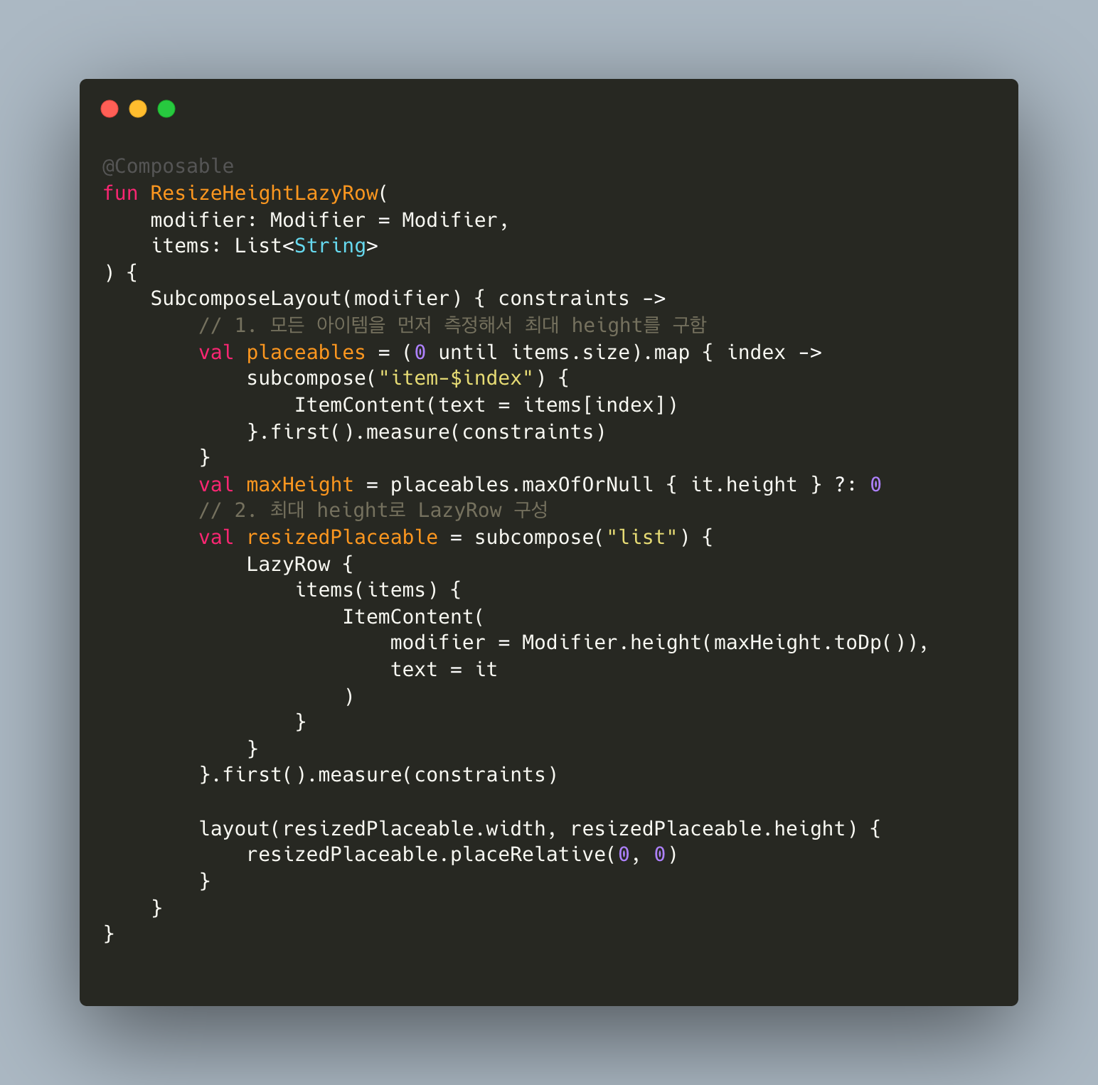 이후, LazyRow의 아이템의 높이를 maxHeight로 맞춰주고 layout 단계에서 배치를 해주면 끝입니다.