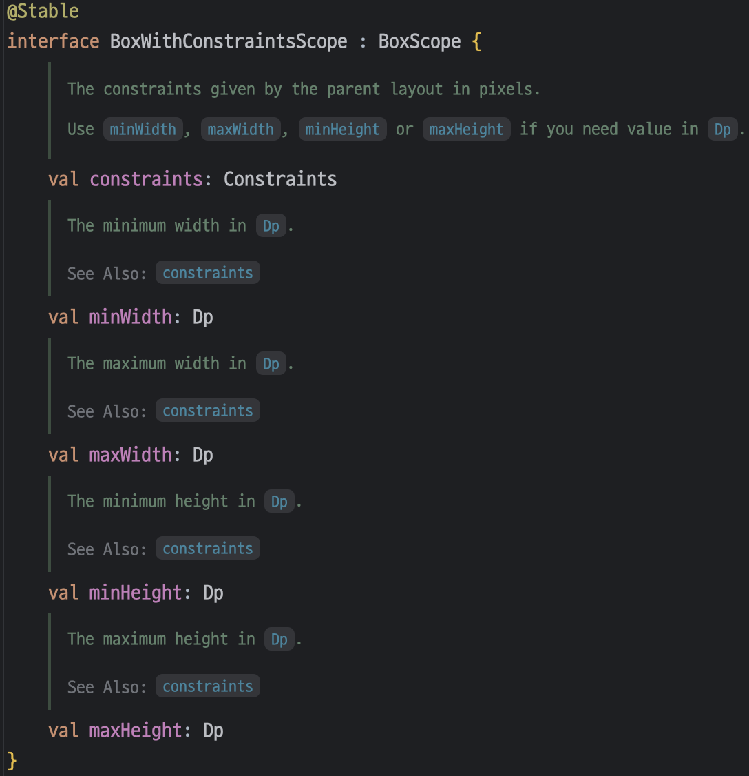 content 블럭은 BoxWithConstraintScope를 이용하는데, 해당 스코프에선 제약사항과 최소, 최대 너비와 높이를 사용할 수 있습니다.