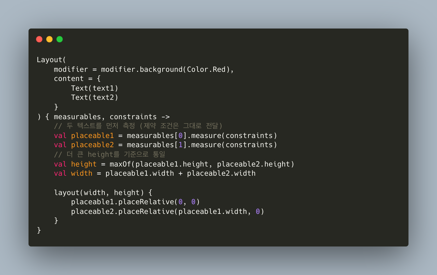 Layout과 SubComposeLayout의 차이를 살펴보기 전에 Layout에 대해 간단히 짚고 넘어가 보시죠.