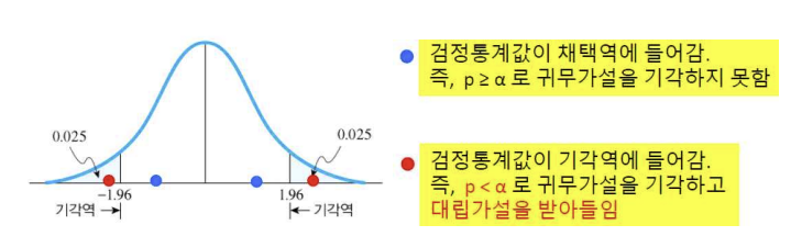 - P값이 유의 수준보다 작다면 검정 통계량 값이 기각역에 들어간다는 것을 의미