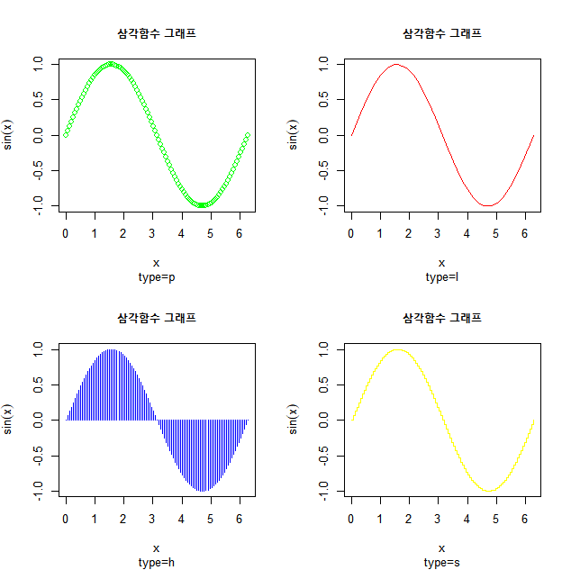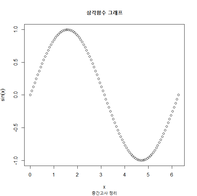 plot(x,y,ylab=expression(sin(x)),main="삼각함수 그래프", sub="중간고사 정리")