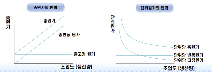 총원가: 원가의 합계로서 조업도가 증가할수록 증가단위원가: 총원가를 조업도로 나눈 것으로 보통 평균 원가(단가)로 부름- 가격결정을 위해서 관리자는 단위당 원가에 관심을 기울여야 한다.