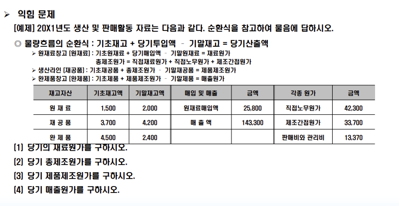 - 매출원가 = 기초 완제품 + 제품 제조원가 - 기말 완제품