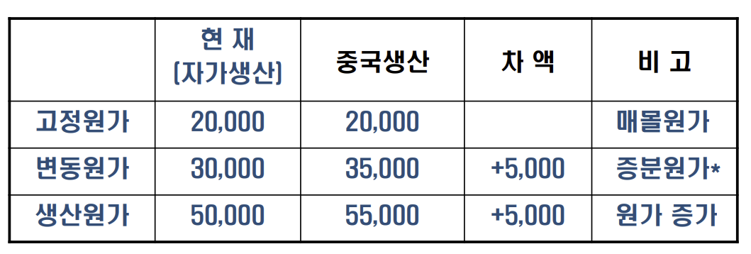 - 그리고 개당 350원에 납품하겠다는 제의가 들어왔으므로, 350*100은 35,000원으로 자가생산에서의 변동원가보다 5000원이 늘어난다. 그러면 자동적으로 생산원가도 5000원이 늘어나는 55,000원이 될 것이고